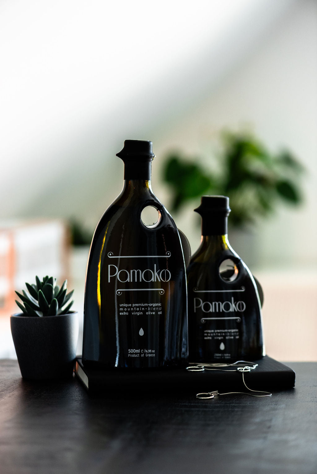 A Pamako Blend a Krétai-tenger felé lejtő északi fekvésű lankákon termő koroneiki és a sziget középső-déli részén 500-700 méteres tengerszint feletti magasságban élő tsounati olíva fajták házasítása. A fák életkora átlagosan több, mint 200 év. Az olívaolaj bio-organikus módon termesztett, kézzel betakarított bogyókból, a legmodernebb technológia alkalmazásával készül. A palackozás kézzel történik, velencei üvegből készült, elegáns palackokba.