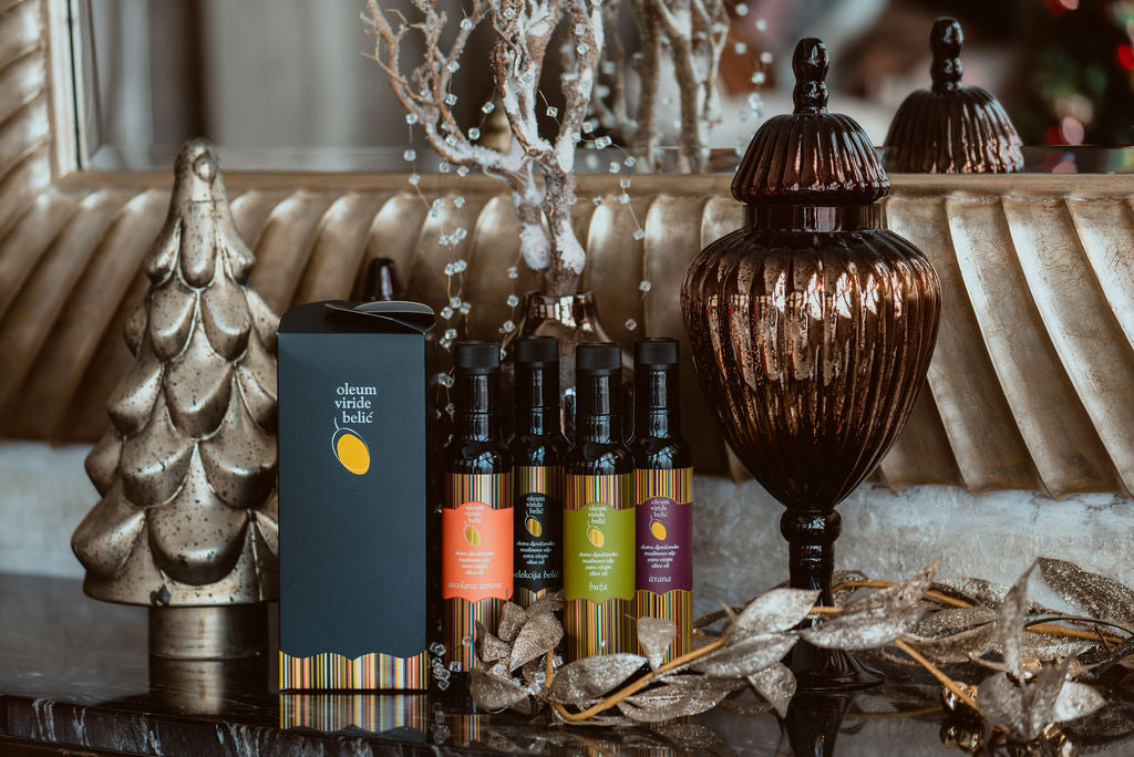 Ebbe az elegáns díszdobozba 4 új isztriai, prémium extra szűz olívaolajunkat csomagoltuk. A termelő, az Oleum Viride Belic egy kis családi vállalkozás, és bár viszonylag kis tételeket termelnek, olívaolajaik helyet kapnak számtalan fine dining étteremben.