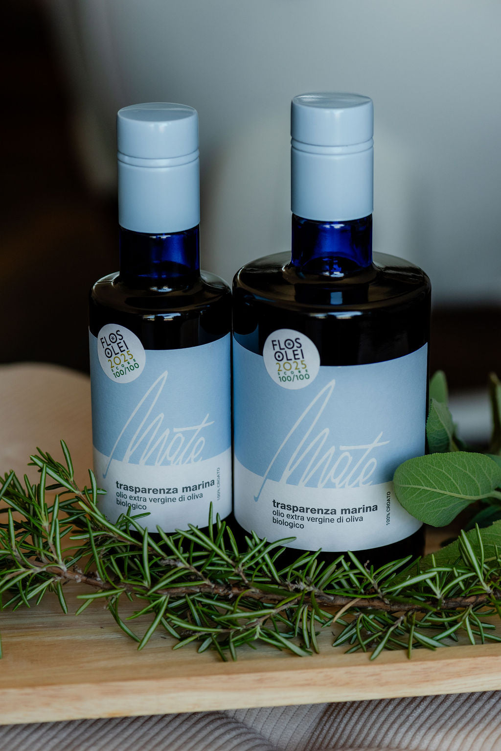 A MATE trasparenza marina extra szűz olívaolaj címkéjét a tenger színe ihlette. Az olívaolaj a leccino és pendolino fajták házasításával készül.